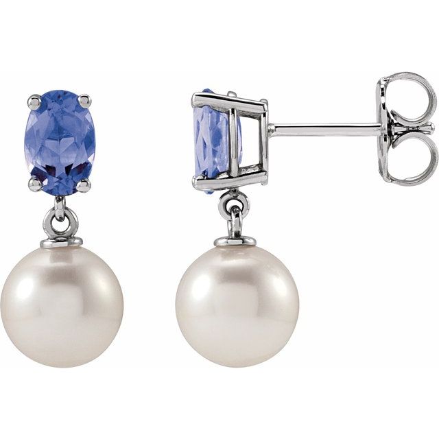 Description: Cultured White Akoya Pearl And Natural Tanzanite Earrings