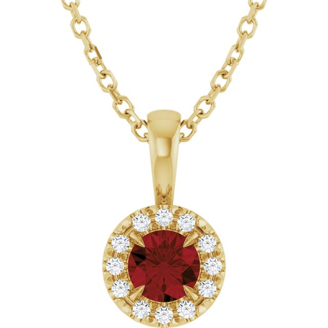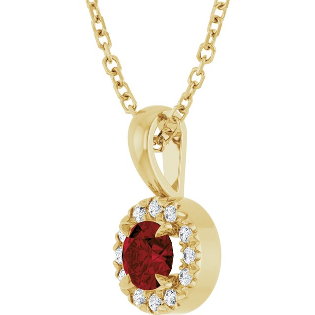 / Necklace / Set / 14K Yellow / Round / Natural Mozambique Garnet / 4Mm :: 0.05 Ctw / Natural Diamond / I1, G-H / 16-18 In / Polished / Natural Mozambique Garnet And .05 Ctw Natural Diamond French-Set Halo-Style Necklace