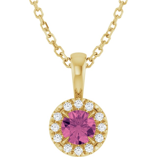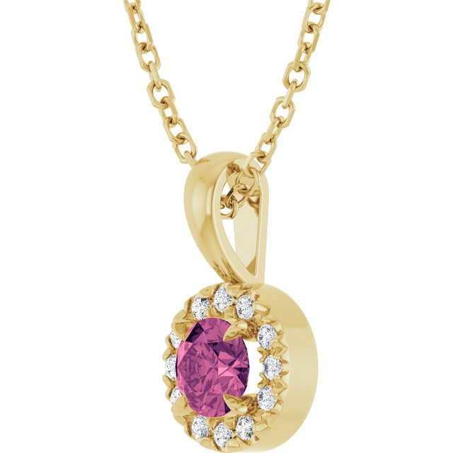 / Necklace / Set / 14K Yellow / Round / Natural Pink Tourmaline / 4Mm :: 0.05 Ctw / Natural Diamond / I1, G-H / 16-18 In / Polished / Natural Pink Tourmaline And .05 Ctw Natural Diamond French-Set Halo-Style Necklace