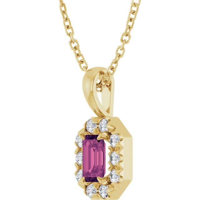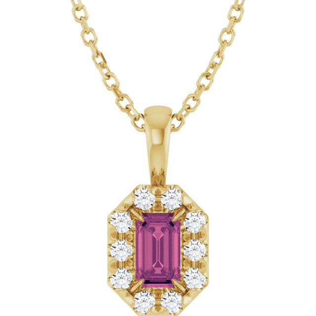 / Necklace / Set / 14K Yellow / Emerald / Natural Pink Tourmaline / 5 X 3Mm :: 1/8 Ctw / Natural Diamond / I1, G-H / 16-18 In / Polished / Natural Pink Tourmaline And 1/8 Ctw Natural Diamond French-Set Halo-Style Necklace