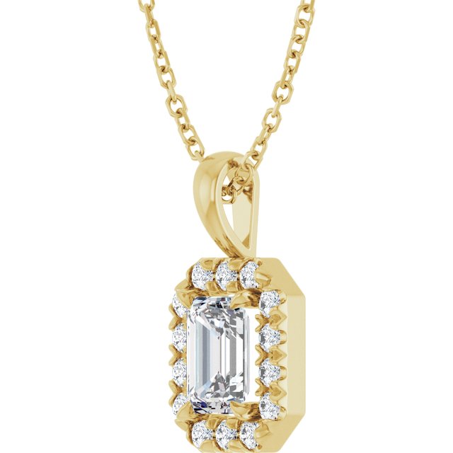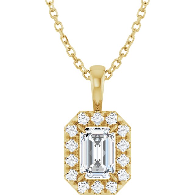 / Necklace / Set / 14K Yellow / Emerald / Natural White Sapphire / 6 X 4Mm :: 1/5 Ctw / Natural Diamond / I1, G-H / 16-18 In / Polished / Natural White Sapphire And 1/5 Ctw Natural Diamond French-Set Halo-Style Necklace
