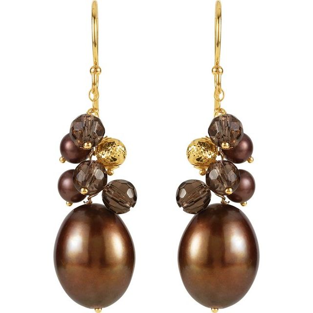 14K Yellow Cultured Dyed Chocolate Freshwater Pearl & Natural Smoky Quartz Earrings