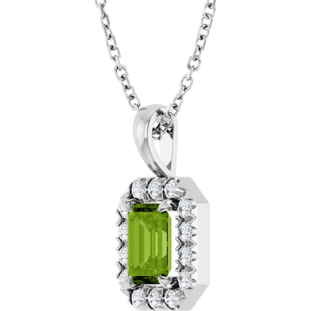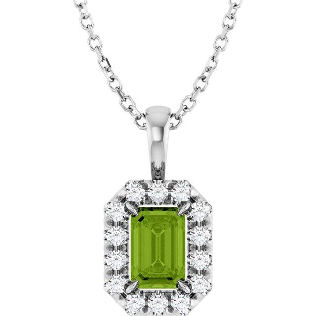 / Necklace / Set / Platinum / Emerald / Natural Peridot / 6 X 4Mm :: 1/5 Ctw / Natural Diamond / Si2-Si3, G-H / 16-18 In / Polished / Natural Peridot And 1/5 Ctw Natural Diamond French-Set Halo-Style Necklace