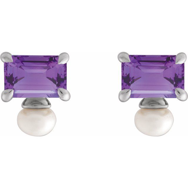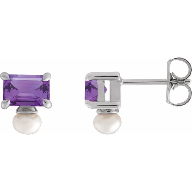 / Earring / Set / Natural Amethyst / Emerald / 6 X 4 Mm / Platinum / Cultured White Freshwater Pearl / Pair / Friction Backs Included / Polished / Natural Amethyst And Cultured Pearl Stud Earrings