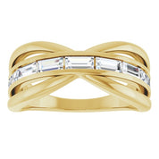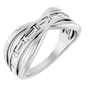 Discover the elegance of our stunning criss-cross ring, a perfect blend of sophistication and modern design. Crafted from high-quality materials, this exquisite ring features a remarkable 1 1/6 CTW of natural diamonds, showcasing the beauty of straight baguette stones measuring 4 x 2 mm. The polished finish enhances the ring's allure, making it an ideal accessory for any occasion.