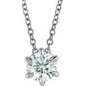 | Specifications: Surface Finish: Polished Plating Type: Rhodium-Plated Primary Stone Size: 5.5 mm Primary Stone Carat Weight: 5/8 CTW Diamond CTW: 5/8 CT Prong Count: 6-prong Primary Prong Style: Claw-Prong Pendant Dimensions: 6.8 mm Chain Style: Cable Chain Width: 1 mm |