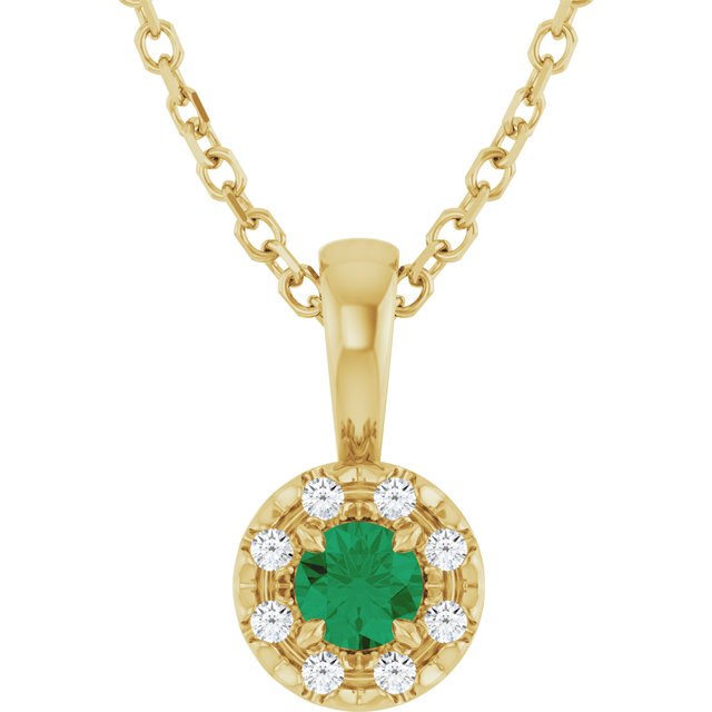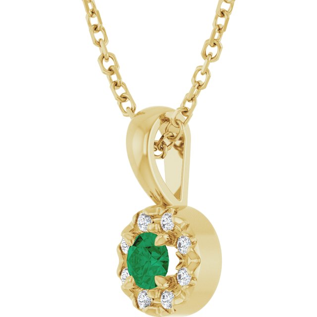 / Necklace / Set / 14K Yellow / Round / Lab-Grown Emerald / 3Mm :: 0.03 Ctw / Natural Diamond / I1, G-H / 16-18 In / Polished / Lab-Grown Emerald And .03 Ctw Natural Diamond French-Set Halo-Style Necklace