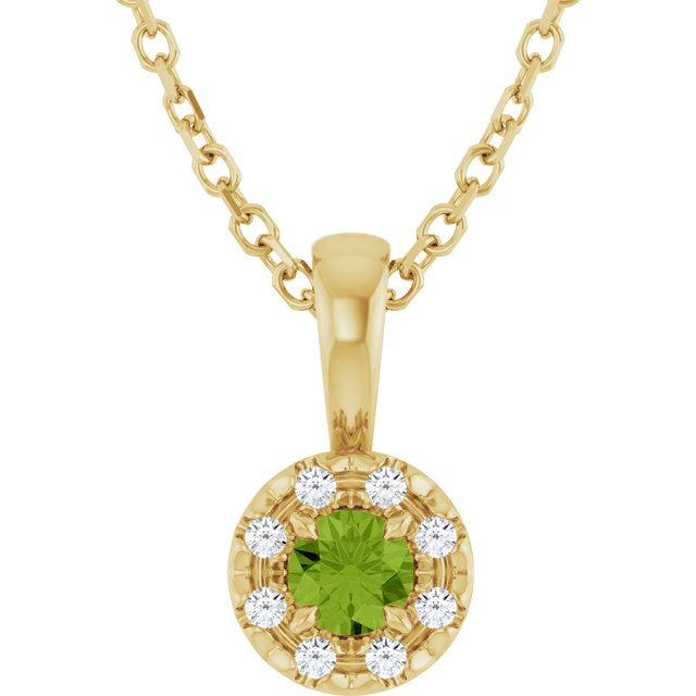 / Necklace / Set / 14K Yellow / Round / Natural Peridot / 3Mm :: 0.03 Ctw / Natural Diamond / I1, G-H / 16-18 In / Polished / Natural Peridot And .03 Ctw Natural Diamond French-Set Halo-Style Necklace