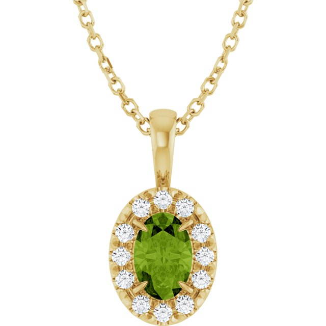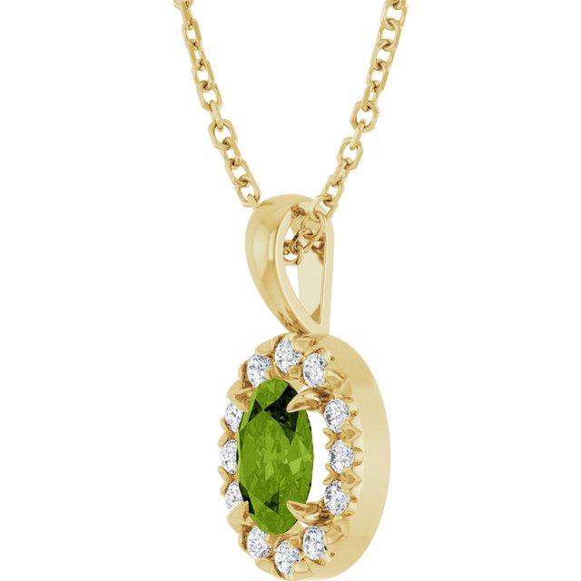 / Necklace / Set / 14K Yellow / Oval / Natural Peridot / 5 X 3Mm :: 0.05 Ctw / Natural Diamond / I1, G-H / 16-18 In / Polished / Natural Peridot And .05 Ctw Natural Diamond French-Set Halo-Style Necklace