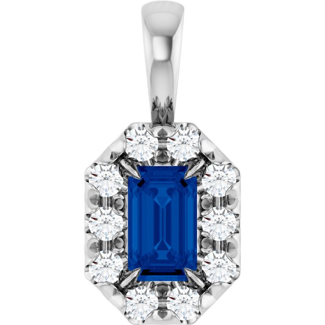 / Pendant / Set / Platinum / Emerald / Lab-Grown Blue Sapphire / 5 X 3Mm :: 1/8 Ctw / Natural Diamond / Si2-Si3, G-H / Polished / Lab-Grown Blue Sapphire And 1/8 Ctw Natural Diamond French-Set Halo-Style Pendant