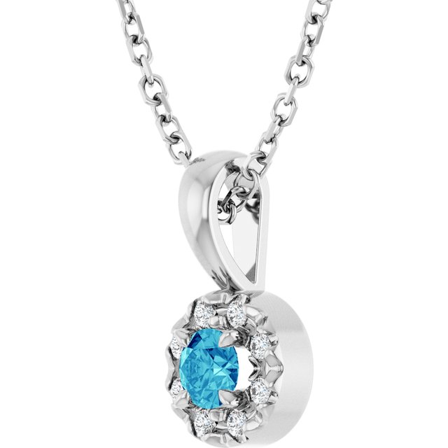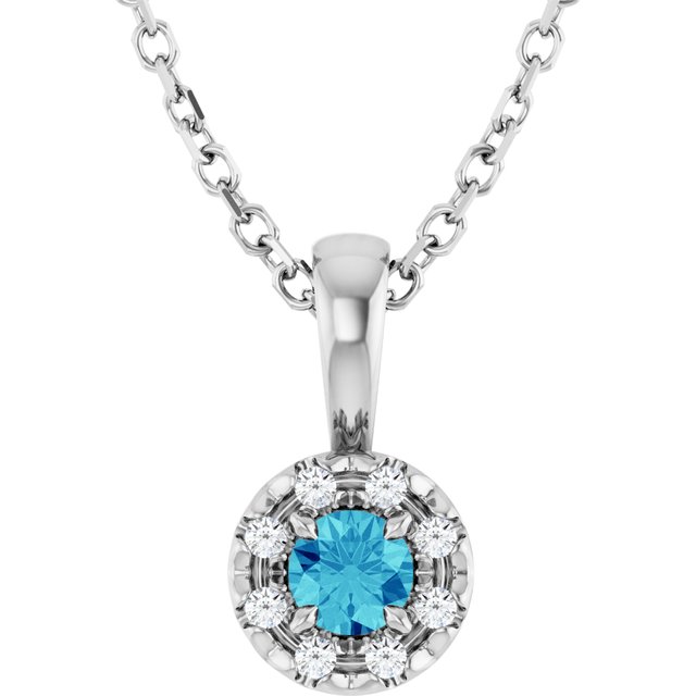 / Necklace / Set / 14K White / Round / Natural Blue Zircon / 3Mm :: 0.03 Ctw / Natural Diamond / I1, G-H / 16-18 In / Polished / Natural Blue Zircon And .03 Ctw Natural Diamond French-Set Halo-Style Necklace