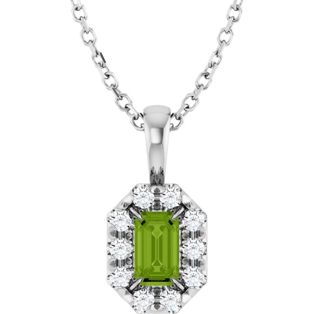 / Necklace / Set / 14K White / Emerald / Natural Peridot / 5 X 3Mm :: 1/8 Ctw / Natural Diamond / I1, G-H / 16-18 In / Polished / Natural Peridot And 1/8 Ctw Natural Diamond French-Set Halo-Style Necklace