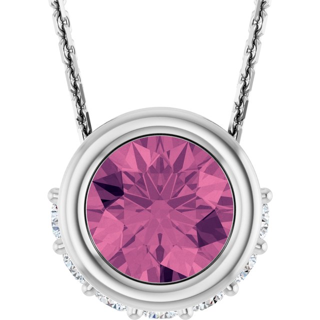 / Necklace / Set / 14K White / Round / Natural Pink Tourmaline / 5Mm :: 1/10 Ctw / Natural Diamond / I1, G-H / 18 In / Polished / Natural Pink Tourmaline And 1/10 Ctw Natural Diamond Hidden Halo Necklace