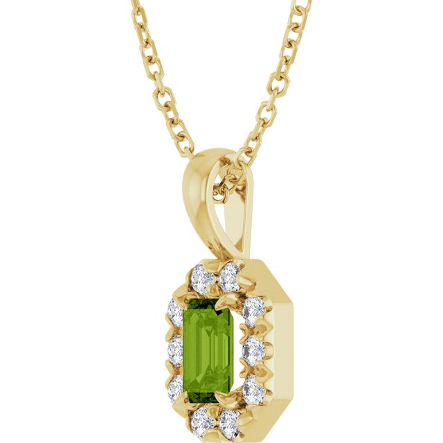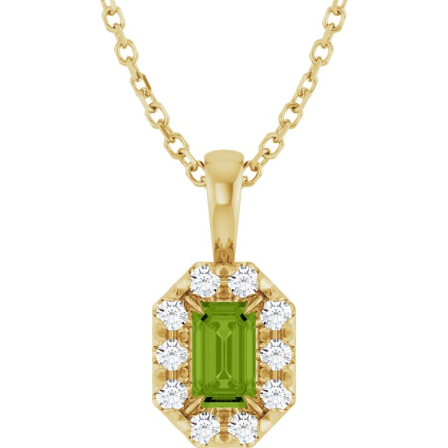 / Necklace / Set / 14K Yellow / Emerald / Natural Peridot / 5 X 3Mm :: 1/8 Ctw / Natural Diamond / I1, G-H / 16-18 In / Polished / Natural Peridot And 1/8 Ctw Natural Diamond French-Set Halo-Style Necklace