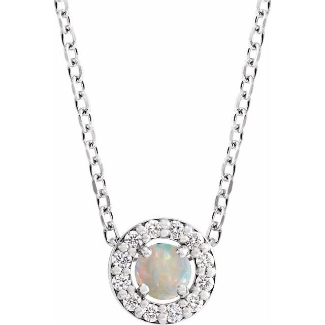 / Necklace / Set / Platinum / Round / Natural White Opal / 4Mm :: 0.06 Ctw / Natural Diamond / Si2-Si3, G-H / 16-18 In / Polished / Cabochon Natural White Opal And .06 Ctw Natural Diamond Halo-Style Necklace