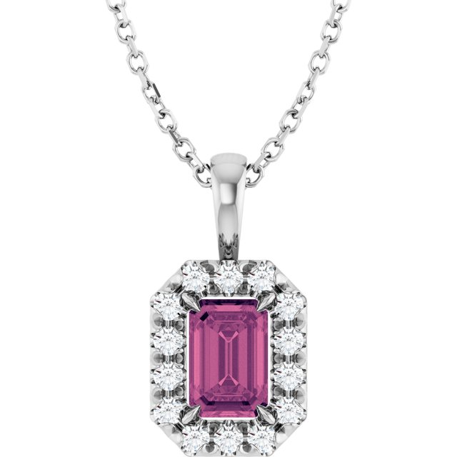 Description: Natural Pink Tourmaline And 1/5 Ctw Natural Diamond French-Set Halo-Style Necklace