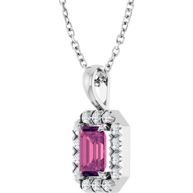 / Necklace / Set / Sterling Silver / Emerald / Natural Pink Tourmaline / 6 X 4Mm :: 1/5 Ctw / Natural Diamond / I1, G-H / 16-18 In / Polished / Natural Pink Tourmaline And 1/5 Ctw Natural Diamond French-Set Halo-Style Necklace