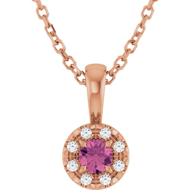 / Necklace / Set / 14K Rose / Round / Natural Pink Tourmaline / 3Mm :: 0.03 Ctw / Natural Diamond / I1, G-H / 16-18 In / Polished / Natural Pink Tourmaline And .03 Ctw Natural Diamond French-Set Halo-Style Necklace