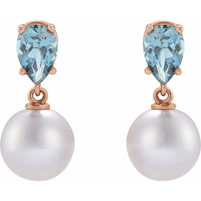 14K Rose Cultured White Akoya Pearl & Natural Aquamarine Earrings