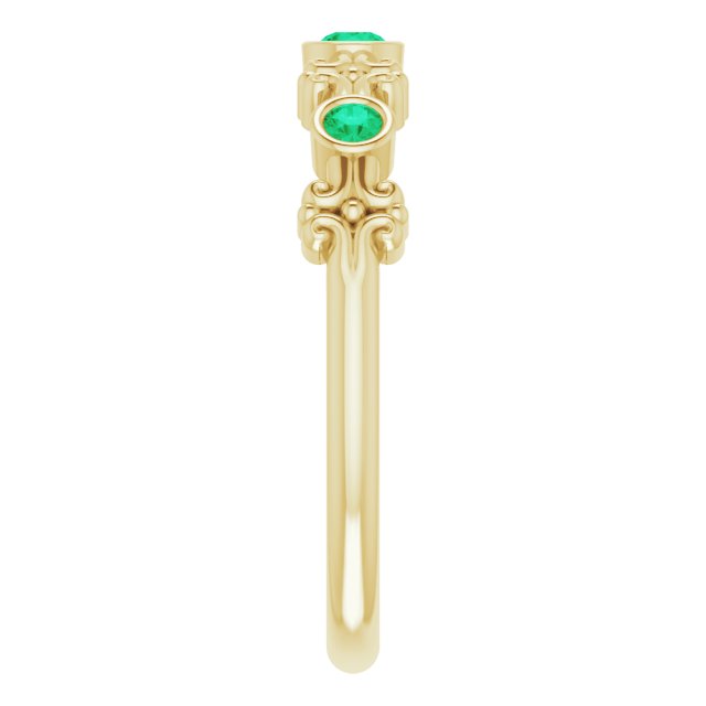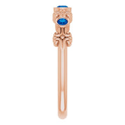 The gemstones are carefully selected for their quality and brilliance. Lab-grown stones offer vibrant colors and eco-friendly appeal, while natural stones bring timeless allure and unique character. Each ring is set with multiple stones, typically featuring a combination of two smaller and one larger round faceted gems, enhancing the overall sparkle and sophistication.